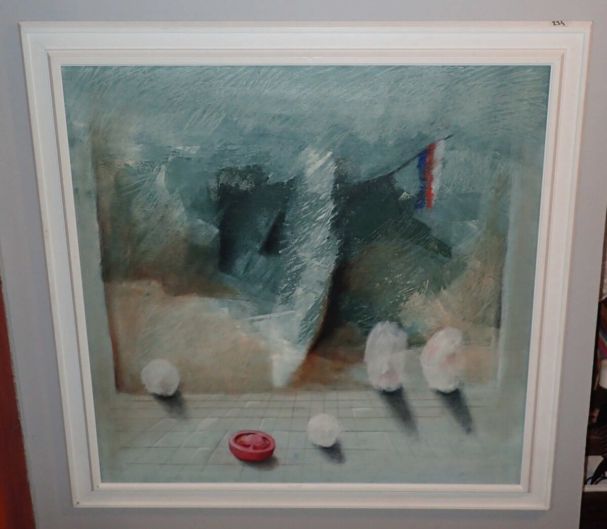 Obraz - Kompozice XXI. Signován vpravo dole - viz foto. Autorem je ceněný a vyhledávaný malíř Rudolf Mikyška. Obraz galerijní kvality a velikosti, navíc na plátně. Pochází z období, kdy byl autor na vrcholu a sbíral za svou tvorbu mnohá ocenění.
