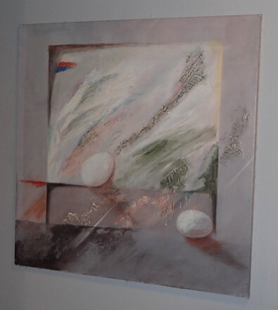 Obraz - Kompozice XXIV. Signován vpravo dole - viz foto. Autorem je ceněný a vyhledávaný malíř Rudolf Mikyška. Obraz galerijní kvality a velikosti, navíc na plátně. Pochází z období, kdy byl autor na vrcholu a sbíral za svou tvorbu mnohá ocenění.