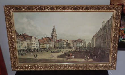 Obraz - Starý trh v Drážďanech (Der altmarkt zu Dresden, von der Schloss-strasse gesehen). Starší luxusní reprodukce obrazu od známého italského malíře Bernarda Bellotta. Zezadu obrazu je štítek, kde je uveden autor originálu a název díla - viz foto.