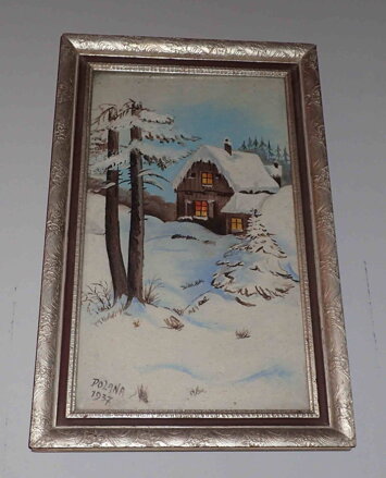 Obraz - Chaloupka v zimě. Autorem je malíř Dolana. Signován a datován vlevo dole - viz foto. V prodeji máme od tohoto autora párový obraz s názvem "Řeka za vesnicí", který má stejný rozměr, téma, rám atd - viz zde...