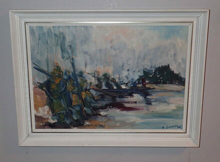 Obraz - Výlov u Hrusic. Signován a datován vpravo dole - viz foto. Autorem je ceněný a vyhledávaný malíř a grafik Jan Dvořák. Osobitý styl malby nesoucí prvky imprese. Zezadu obrazu je autorský štítek, kde je uveden autor, název díla, technika, rozměr atd - vše viz foto.