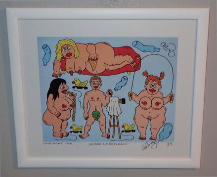 Obraz - Saudek s modelkami. Autorem je známý malíř, grafik, hudebník, divadelník, spisovatel a textař František Ringo Čech. Signován a datován vpravo dole - viz foto. Umělecký tisk vlevo dole - viz foto. Název díla uprostřed dole - viz foto. Osobitý naivistický styl, pestrá paleta barev, specifický druh humoru.