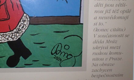 Obraz - Děda Mráz krade! Autorem je známý malíř, grafik, hudebník, divadelník, spisovatel a textař František Ringo Čech. Signován a datován vpravo dole v tiskové ploše - viz foto. Název díla uprostřed nahoře - viz foto. Osobitý naivistický styl, pestrá paleta barev, specifický druh humoru.