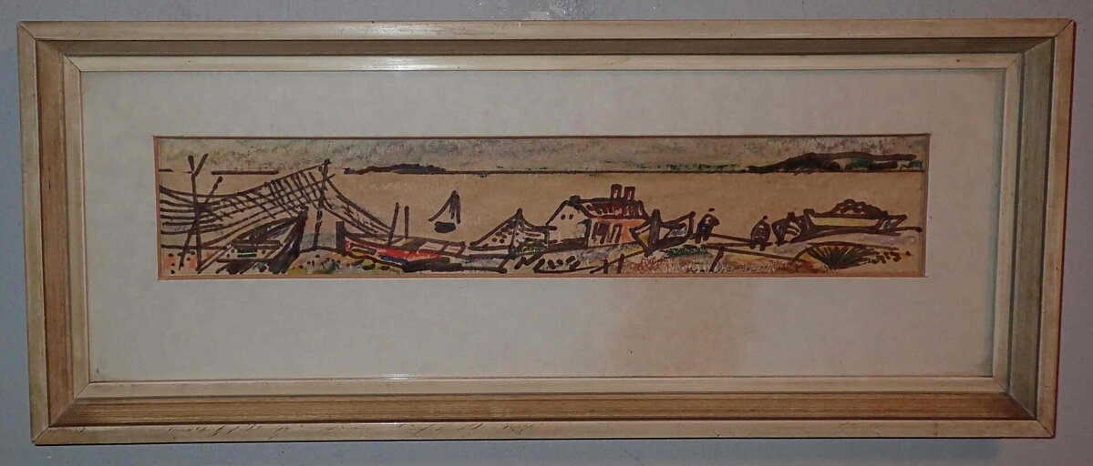 Rozměry včetně rámu cca 73 cm x 58 cm, rám je úzký, místy má otluky. Akvarel a tuš na papíře. Obraz je zasklený. Celkový stav - viz foto.