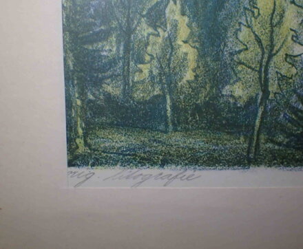 Originální barevná litografie - Vodní nádrž Kružberk. Signován vpravo dole - viz foto. Technika vlevo dole - viz foto. Autorem je akademický malíř a grafik Jan Hrnčárek.
