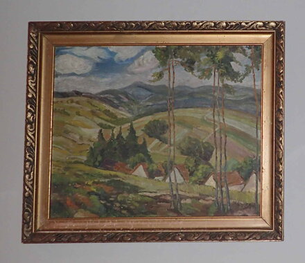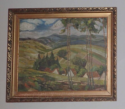Obraz - Ves pod Beskydy. Signován vpravo dole - viz foto. Autorkou je malířka Matoušková.