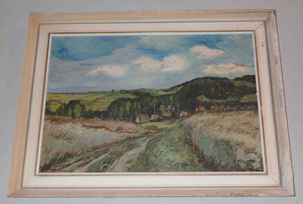 Obraz - Polní cesta do vsi. Signován vpravo dole - viz foto. Autorem je malíř Václav Měchura *1908 malíř z Vysokého Mýta.