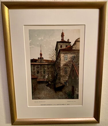 Obraz - Nádvoří Konviktu u sv. Bartoloměje č.p. 293-I (Pragensia). Jedná se o reprodukci obrazu od známého malíře Václava Jansy. Signován a datován vlevo dole - viz foto. Název díla uprostřed dole - viz foto.