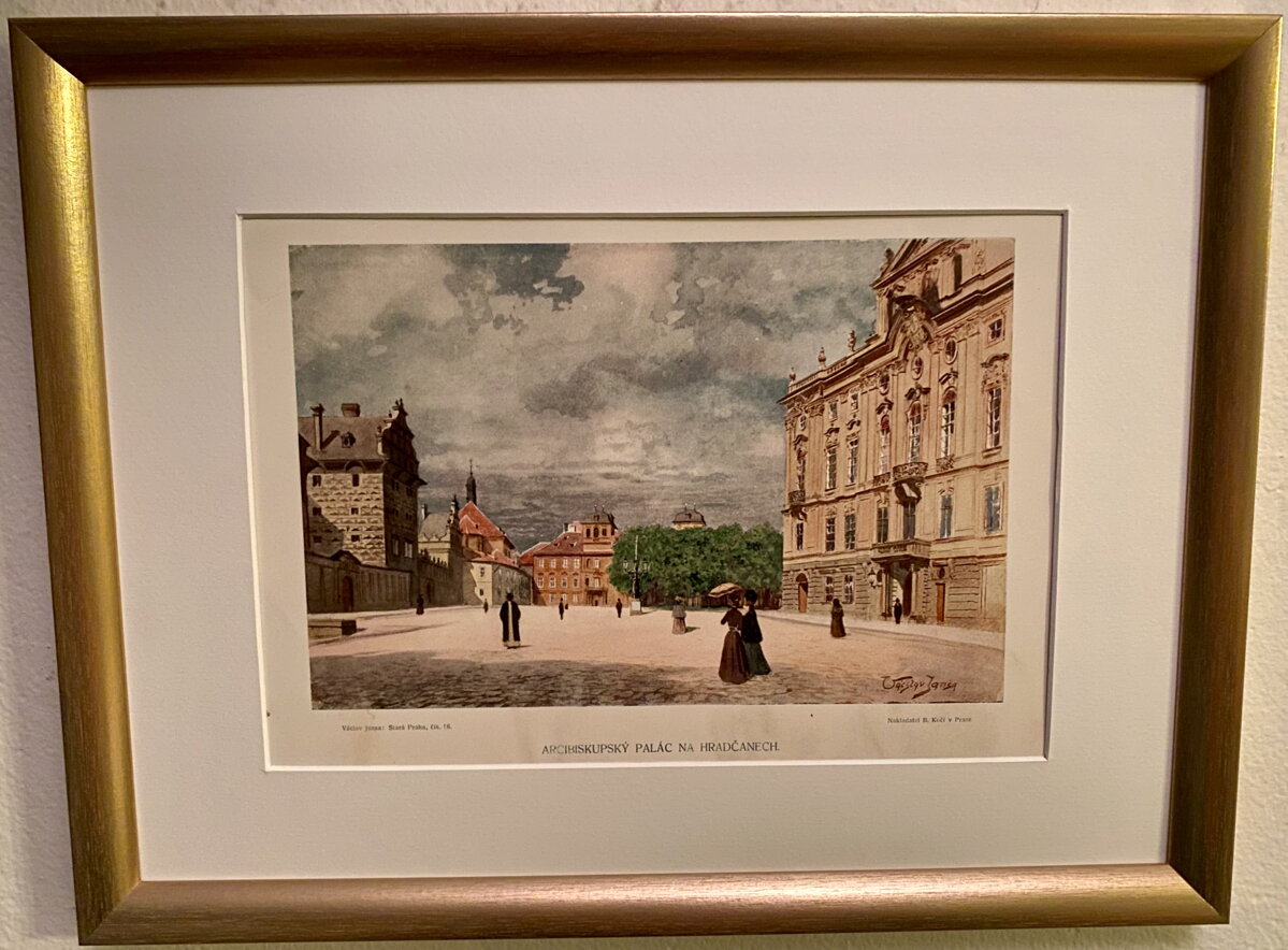 Obraz - Arcibiskupský palác na Hradčanech (Pragensia). Jedná se o reprodukci obrazu od známého malíře Václava Jansy. Signován vpravo dole - viz foto. Název díla uprostřed dole - viz foto.