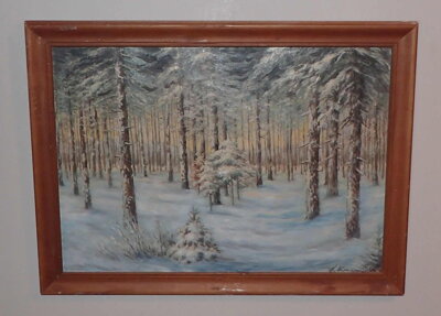 Obraz - Zasněžený smrkový les. Signován vpravo dole - viz foto. Autorem je malíř F. Krupička.