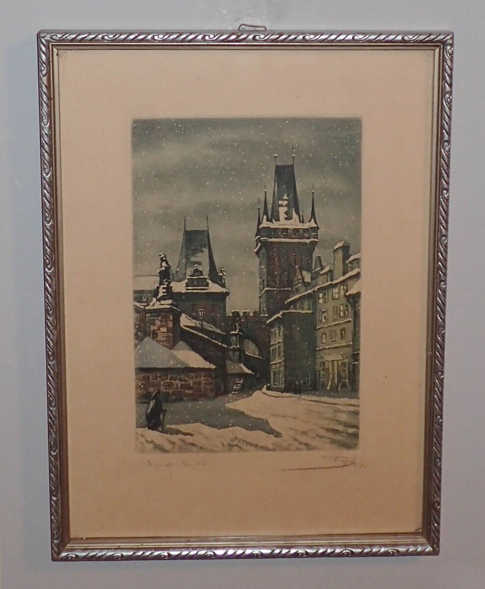 Originální signovaný barevný lept - Mostecké věže (Pragensia). Signován vpravo dole - viz foto. Autorem je malíř Václav Souček. Často spolupracoval s grafikem Josefem Mayerem (26.2.1895 - 1952) který mu jeho malby převáděl na grafiky. Tvořili spolu různé cykly například "Praha" či "Praha matka měst" apod. Tento lept pochází ze souboru "Praha matka měst".