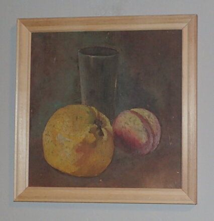 Rozměry včetně rámu cca 23 cm x 23 cm. Rám je dřevěný, místy má otluky - viz foto. Olej či tempera na kartonu. Celkový stav - viz foto.
