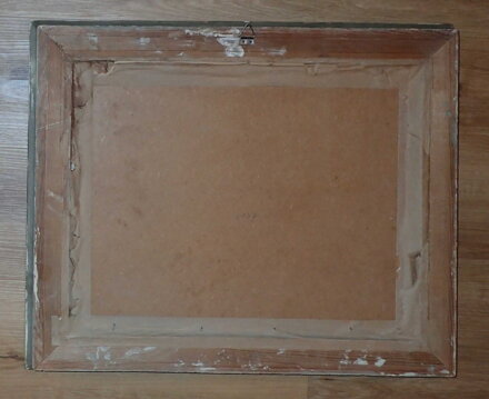 Rozměry včetně rámu cca 57 cm x 47 cm. Rám je mohutný, zdobený, místy má otluky - viz foto. Olej na desce. Celkový stav - viz foto.