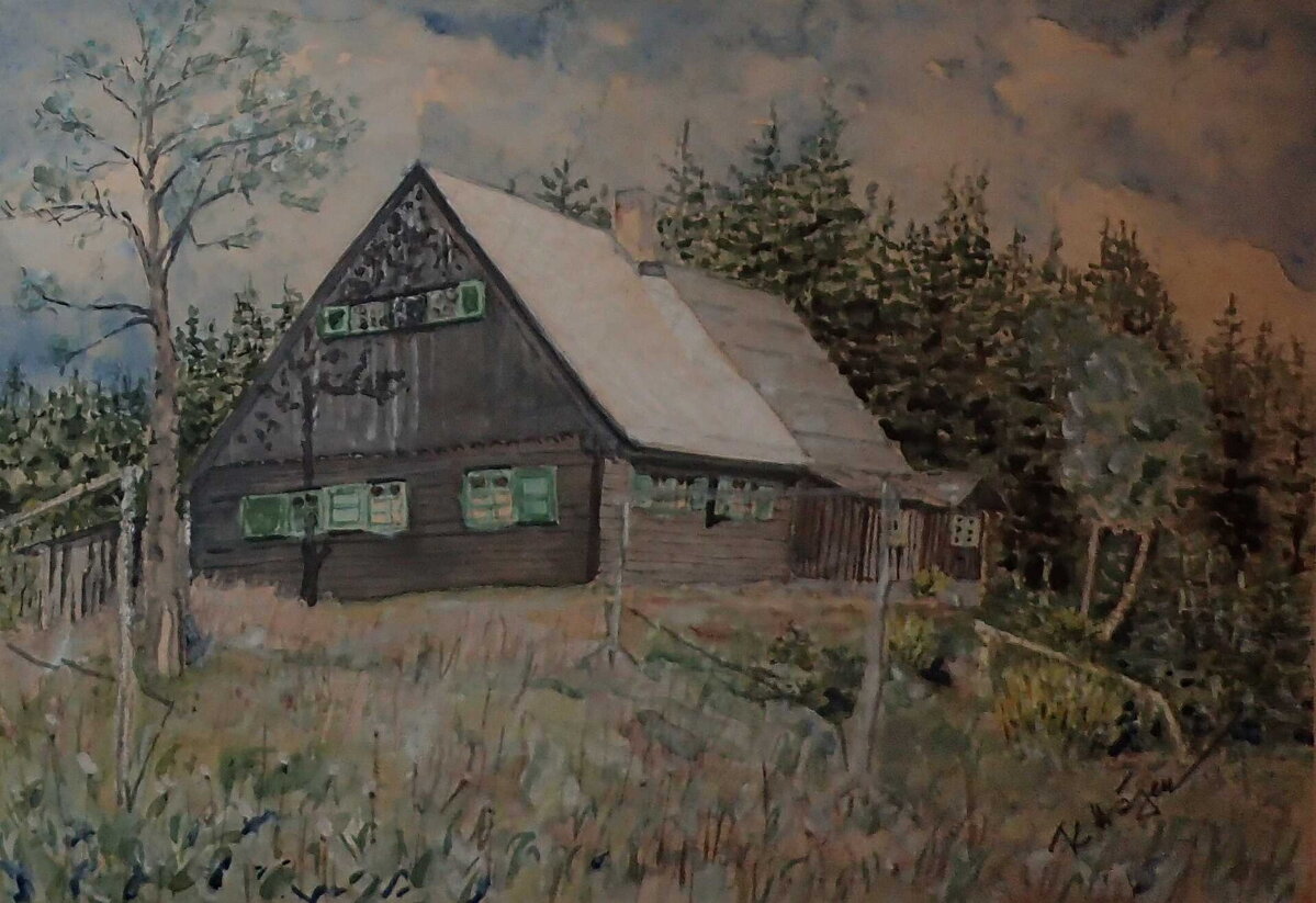 Obraz - Roubenka u lesa. Autorem je malíř Hájek. Signován vpravo dole - viz foto.