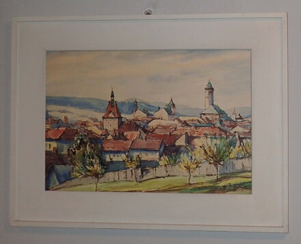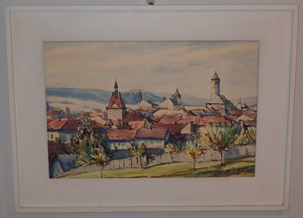Obraz - Pohled na Domažlice. Signován vpravo dole - viz foto. Autorem je malíř Jaroslav Tykal. Osobitý styl malby.