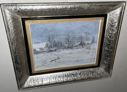 Obraz - Slavníč v zimě. Autorem je zřejmě vyhledávaný malíř František Škrabánek s ohledem na motiv díla a styl malby.