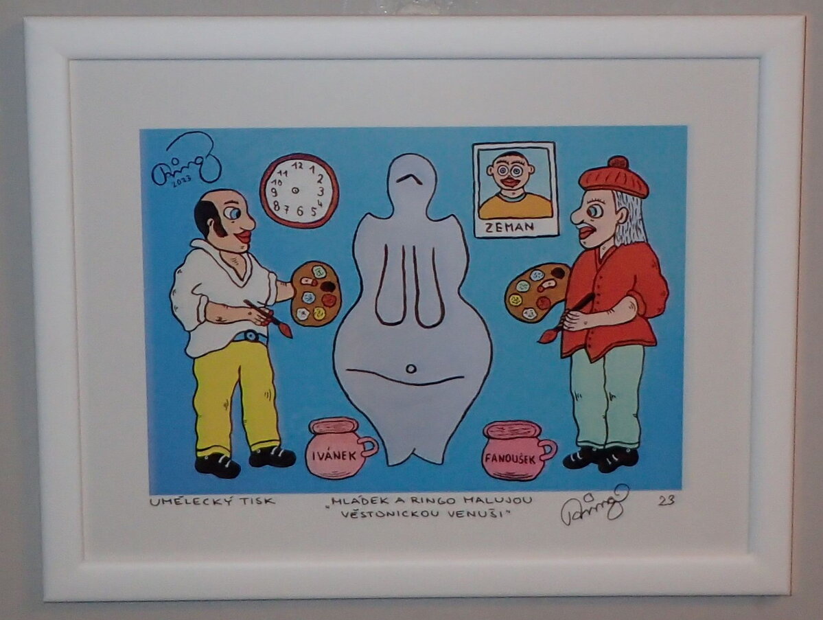Obraz - Mládek a Ringo malujou Věstonickou Venuši. Autorem je známý malíř, grafik, hudebník, divadelník, spisovatel a textař František Ringo Čech. Signován a datován vpravo dole - viz foto. Umělecký tisk vlevo dole - viz foto. Název díla uprostřed dole - viz foto. Osobitý naivistický styl, pestrá paleta barev, specifický druh humoru.