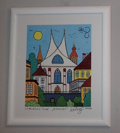 Obraz - Emauzy (Pragensia). Autorem je známý malíř, grafik, hudebník, divadelník, spisovatel a textař František Ringo Čech. Signován a datován vpravo dole - viz foto. Umělecký tisk vlevo dole - viz foto. Název díla uprostřed dole - viz foto. Osobitý naivistický styl, pestrá paleta barev, specifický druh humoru.